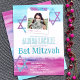Colourful Bat Mitzvah invitation with turquoise, aqua, pink, and purple glitter artwork. Cute square photo with star of David artwork on colourful texture background is a festive look for your bat mitzvah celebration. Photo caption can be changed to any wording you choose. Easily upload your photo into the photo frame. Glitter tape gives this bat mitzvah invitation a scrapbook aesthetic.