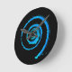 Wall clock with image an abstract image of a light blue twirl on black, on the face of the clock. Customisable.
