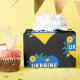 Colourful wrapping paper design supporting the people of Ukraine features pattern of heart shaped Ukrainian flag in blue and yellow with a vine of flowers and centre Ukraine text. Black background