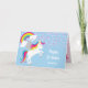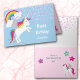Here's a cute birthday card for any child, but especially for a little girl. A cute white unicorn with pink, blue, and yellow striped mane and tail rears playfully on the front of the card. Behind the unicorn is a matching rainbow between two white clouds. Your custom text is in white at the lower right. Everything is placed on a pastel blue background with pink and white confetti. The inside of the card has another image of the little unicorn, with several bright stars on a pale pink background.