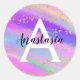 Girly and glam classic round sticker with a colourful unicorn rainbow background, and gold glitter sparkles confetti. Personalise with your custom name in black and your monogram initial in white. You can change the text colour and font style and size using the customise option.