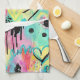Colourful urban graffiti patchwork pattern kitchen towel featuring bold abstract blocks, expressive brush strokes, scribbles, stars, and mixed-media textures in bright blue, yellow, pink, orange, and black. Energetic and edgy with a modern street art aesthetic, this seamless design is ideal for graffiti art lovers, maximalist style fans, creative teens, and contemporary art enthusiasts.