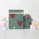 Christmas theme wrapping paper featuring colourful hand-drawn holiday symbols with red gold and forest green colours.