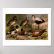 A classical painting in full colour, depicting six ducks, both male and female. The birds are standing next to a creek, some on tufts of grass, some on rocks. One male duck is swimming in the water in the middle of the painting. All the animals are painted in luscious greens, browns, dewy whites and shades of black.