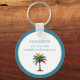 This cute round personalised keychain features a brightly coloured palm tree in watercolor shades of blue, green, yellow and orange. Personalise the back with your choice of name and text.