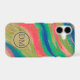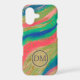 Bright waves of colour flow across the surface of this stunning phone case, including blue, teal, pink, tan, and green. Bits of gold faux glitter particles and streaks add a bit of sparkle and interest. At the lower centre your two letter monogram is in blue grey on a semi transparent circle banner.