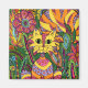 This multicolored striped cat with colourful, highly detailed markings is sitting in the shade of a dense, vivid garden teeming with exotic, ornately patterned plants and flowers in this unique and uplifting design.