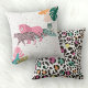 A colourful wild animals design featuring a tiger, lion and a leopard in pink and teal colour tones. Matching colourful tropical leaves and colourful leopard spots are featured in this design to create a chic look. Modern art with cute animals and tropical greenery.
