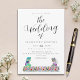 Colourful wildflower dinosaur wedding invitation is perfect for a fun Jurassic dino theme wedding day. With funny colourful dinosaur bride and groom with watercolor wildflower meadow in blue purple pink yellow red and green hues. Easy to use elegant script templates, just add the bride and grooms names, the wedding date and all the important wedding details. Fun unique dino illustrations include brown painted T-Rex bride and groom wearing a veil and bow tie and watercolor summer florals with stylish modern script. Original artwork by artist Catherine Sweetman