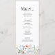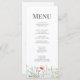 This refined wedding menu features delicate watercolor wildflowers arranged in a soft meadow style, creating a romantic and airy look for your reception tables. Perfect for rustic, garden, boho, and spring weddings. Customise menu items and text easily to match your event’s style.