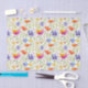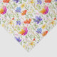 Tissue paper in a Brightly coloured wildflowers in various shapes and sizes are scattered across a white background. The vibrant petals range from deep purple and blue to vivid orange and yellow.