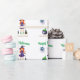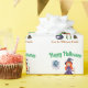 This colourful wrapping paper features a Halloween theme on white. A pretty witch with orange hair is standing next to her bubbling cauldron. A little spider is resting in her web above the witch. The Happy Halloween greeting is placed above the illustration and a sample family name is printed below. You can personalise the wrapping paper to include your own custom name or text.