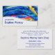 Colourful blue and yellow and red yarn decorates the front of this useful yarn shop or knitting company card.