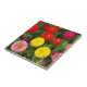 Ceramic tile that features a photo image of colourful Zinnia flowers. A lovely, floral design! Select your tile size. Makes a great kitchen trivet!