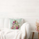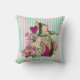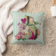 Whimsical throw pillow features a colourized version of vintage Alice's Adventure in Wonderland Queen of Hearts with added floral and flourishes, set on an antique look pink and aqua striped background