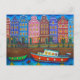 A vibrant and lively stylised night scene of Amsterdam's colourful, narrow houses along the canals on a post card by Lisa Lorenz
