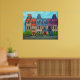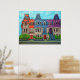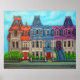 Vibrant, stylised painting of the colourful Victorian row houses on Saint-Louis Square in The Plateau district of Montreal, Quebec, by Lisa Lorenz