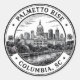 Black-and-white circular stamp-style illustration of the Columbia, South Carolina skyline. The State House dome stands prominently with palmetto trees, framed by historic brick mills and river bridges along the base. Modern towers fade into a soft mist, all enclosed within a vintage Southern badge featuring subtle star accents. “Palmetto Rise” crowns the top, while “Columbia, SC” anchors the bottom in a traditional serif font.