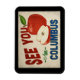 A charming Columbus Ohio vintage travel wall refrigerator magnet featuring a lovely red apple, along with fun retro style text that says, "See you in Columbus"