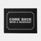 A black doormat saying "Come back with a warrant" in capitalised letters. A funny doormat for people with a special kind of humour and a love for the police.