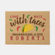 "Come back with tacos" text with a taco illustration, green and red peppers, and your family name - faux burlap background - the perfect doormat for foodies