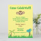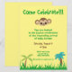 Come celebrate your impending arrival with this gender neutral baby shower invitation. Set upon a yellow background, this design features a monkey and palm trees. The font is green and brown. Place your order today!