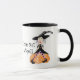 This Funny Come Sit A Spell Halloween Mug features a witch sitting on a pumpkin.