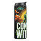 A vivid, stylised illustration features two green-skinned aliens, one large and one small, standing against a vibrant orange and yellow striped sunset. Two flying saucers with light beams are descending. The bold text "COME WITH ME" is prominently displayed, suggesting an extraterrestrial invitation.