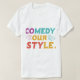 The t-shirt design features the phrase "Comedy Our Style" in a vibrant, multi-coloured font, surrounded by playful cartoon-style shapes and lines. The design conveys a sense of humour, fun, and individuality, celebrating comedy as a way of life.