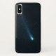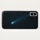 A blazing comet creates a brilliant fuzzy ball in the night sky, followed by a blue wispy tail as it moves slowly among the stars in this enhanced stellar view.