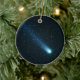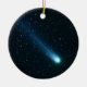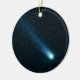 A blazing comet creates a brilliant fuzzy ball in the night sky, followed by a blue wispy tail as it moves slowly among the stars in this enhanced stellar view.