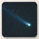A blazing comet creates a brilliant fuzzy ball in the night sky, followed by a blue wispy tail as it moves slowly among the stars in this enhanced stellar view.
