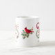 Personalise this mug on the left and right in the template with your name or with the recipient's name if it's a gift with a gold coloured font.. This comfort and joy mug is sure to keep your holiday spirits warm with festive drinks. The typography design and illustration has a red and gold coloured text that reads "Good Tidings of Comfort and Joy". The red text is outlined with a gold colour. The illustrations include red cardinals and curved holly branches with red berries on the left and right, with a larger red cardinal in the centre.