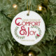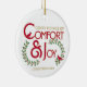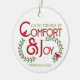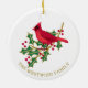 This festive ornament may be personalised with the current year on the front, and with your name or text on the back. The design features vintage typography and illustrations of holly branches with berries and two red cardinals on the front. The red and gold coloured text reads "Good Tidings of Comfort and Joy,". The red text as well as the green holly leaves are outlined with a gold colour. On the back a larger version of a red cardinal sits on a holly branch.