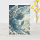 A peaceful angel with large white wings is shown praying while floating in soft clouds. She wears a flowing robe and has gentle features with her eyes closed. The colors are light blue and white, giving the image a calm, heavenly feeling.
