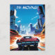 A comic book rendition of a sports car speeding along a highway towards a city. Bright colours, lots of action, totally fun design on this change of address postcard.