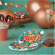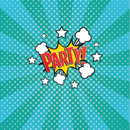 Party paper plates featuring a comic book style typography of 'PARTY!'. This include elements of blue, orange, yellow and red, comic book explosions, stars, and star burst backgrounds. Customise with persons name and event, or leave it blank.
