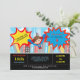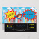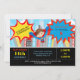 Calling All Superheroes! Grab your mask and cape, and get ready to celebrate! This colourful superhero theme birthday party invitation features a comic style city background with text bubbles personalised with your child's name and age. Party details are below on a black background. Back features comic city background. Easy to personalise with custom options. Use the 'Customise It' button to customise the product, or add text. Look for matching items in our store!