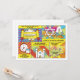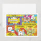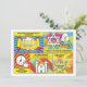 Unique and fun pop art comics comic book Bar Mitzvah invitation. This comic book Bar Mitzvah invitation is modelled after a comic strip like you'd see in the comics section of a newspaper or what you'd see in superhero comic books. It's done up in the pop art comic book style with bright colours, sunbursts and clouds. The different comic strip panes display different religious symbols related to a Bar Mitzvah celebration, including a torah, a Star of David, challah bread, and a tallit prayer scarf. The colours on this comic book themed Bar Mitzvah invitation are bright blue, red, yellow, green, orange pink, black, and white.