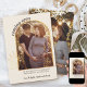 Custom photo birth announcement in gender neutral cream, brown and gold. The photo template is set up for you to add 2 photos - one on the front, which is framed in a gold arch with fine sketched foliage and, one full bleed portrait photo on the back. "coming soon" is lettered in bold, arched typography and the remainder of the wording is fully editable for you to customise with your personalised message, baby due date and name(s). A chic, modern design to share the wonderful news of your pregnancy.