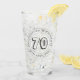 Commemorative birthday celebration glass with person's name, and the date of their birthday. A glass for someone who is 70. Outline number style.