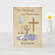 Celebrate a meaningful step in faith with this elegant Communion and Confirmation card, personalised with the recipient’s name on the front. Featuring a beautiful arrangement of Christian symbols—including a cross, chalice, candle and dove—this design reflects the sacred significance of these holy sacraments. A soft tan background with subtle texture adds warmth and grace, making it a cherished keepsake. Inside, a heartfelt message offers blessings and congratulations, perfect for commemorating this special occasion.