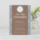 This Communion invitation features a blue cross above the script First Holy Communion in white, on a cocoa brown background. Accenting the sides of the invitation is a blue and brown leaves pattern. Your personalised text in white with the name in blue complete this graceful religious invitation. Graphic courtesy of Dotted Daisy Designs