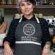 Minimalist black company apron, decorated with white stripes and easily customisable with your own logo, name/position, and optional custom text; perfect for many business categories, such as hairdressers, beauticians, spas, florists, and much more.