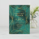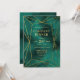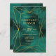 Modern and elegant invitation featuring gold jewel-like geometric lines with a moody emerald watercolor background.