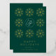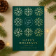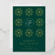 Send season’s greetings in style with this corporate Christmas holiday card template featuring a green background, real gold foil snowflake design, and your custom company logo in the centre. Perfect for businesses wanting to spread holiday cheer to clients, suppliers, and employees, with elegant serif fonts, a personalised “Happy Holidays” message on the front, and space on the back for a custom note and your website (you can also remove the message on the back if not required).. You can choose from gold, silver and rose gold foil.