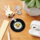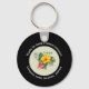 Logo key ring with QR code template on the back. Also add two lines of curved text. Black with white wording.