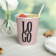 This sophisticated and professional paper cup features a dusty pink coloured background. A simple monogram text or image area appears in the centre. A sample logo is placed in the centre of the box. You can personalise these cups and add your own custom company or business logo.