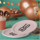 This sophisticated and professional party plate features a dusty pink coloured background. A simple monogram text or image area appears in the centre. A sample logo is placed in the centre of the box. You can personalise these plates and add your own custom company or business logo.