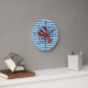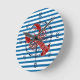 Bright blue and white horizontal pattern design round wall clock with a nautical theme features a lobster and a ship compass!